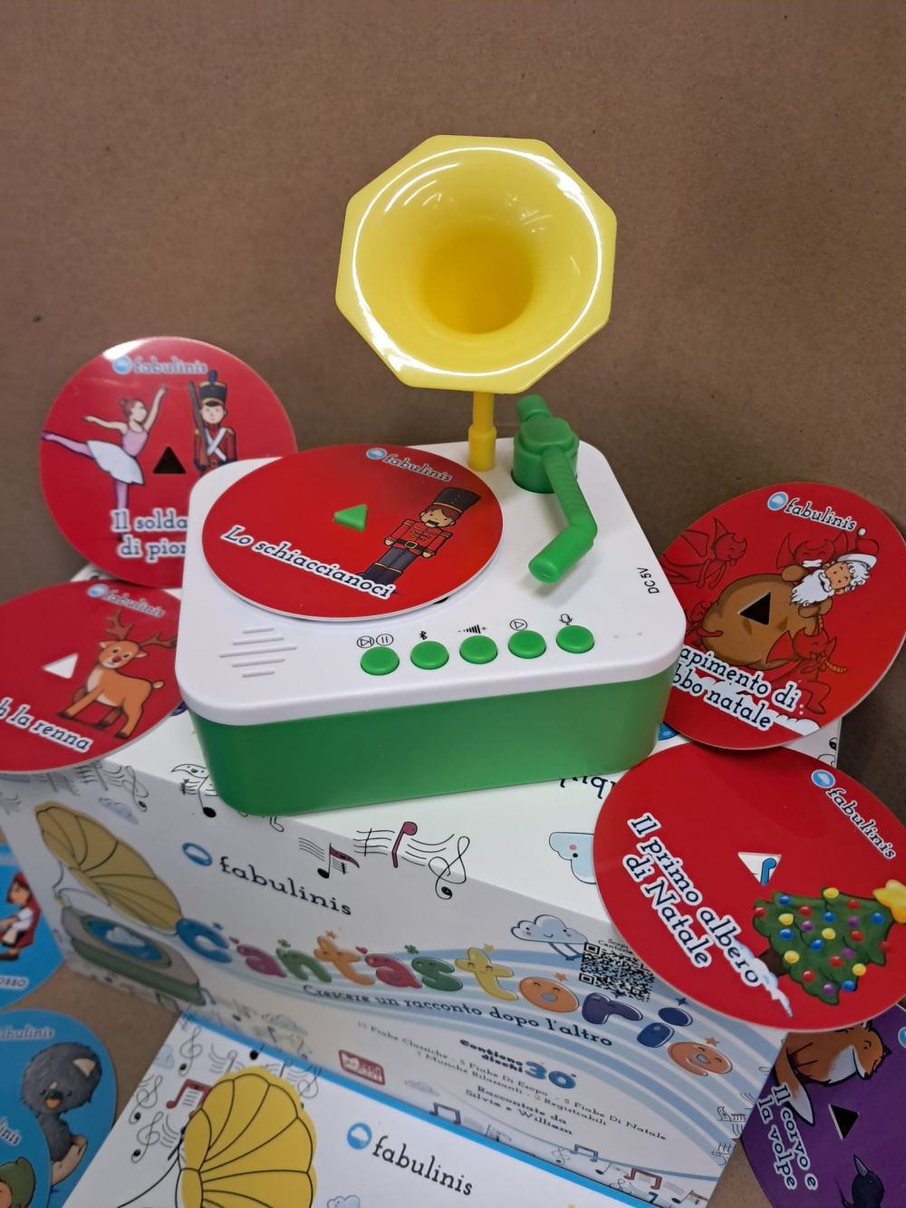 Raccontastorie contenente 30 dischi di fiabe classiche, fiabe di Esopo, fiabe di Natale, musiche rilassanti e 2 registrabili.